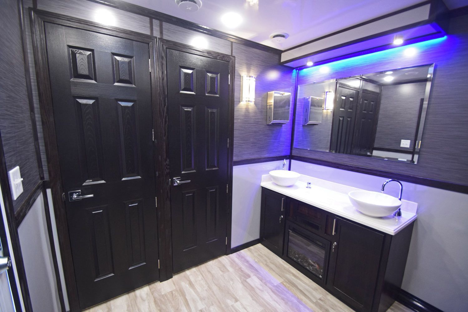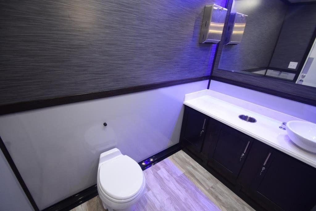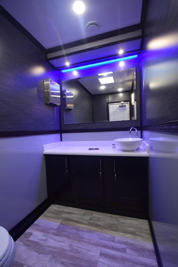 Our 4-Station Luxury Restroom Trailers boast the highest levels of luxury finishes offered in portable restrooms. Each station is completely private, each with its own exterior entrance. Trailers are both heated and air conditioned for maximum comfort in any weather and include an internal Bluetooth audio system to play music of your choice for your guests.